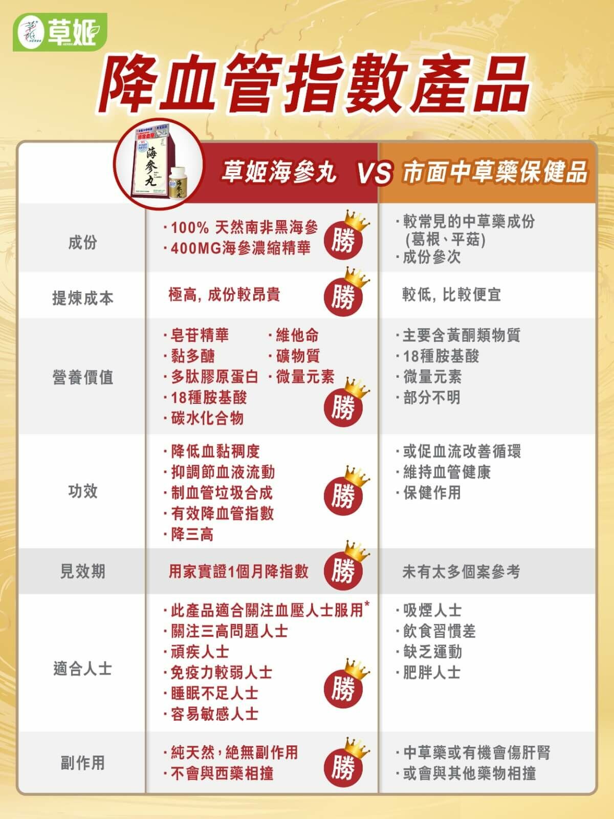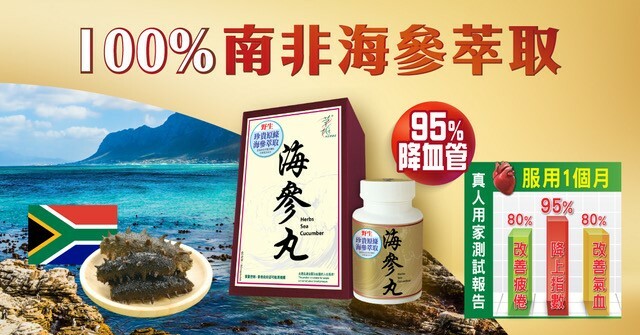 100% 天然南非黑海參、95%降血管指數、80%改善氣血及疲勞