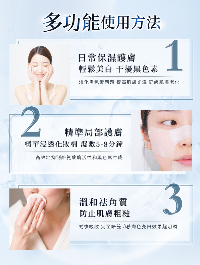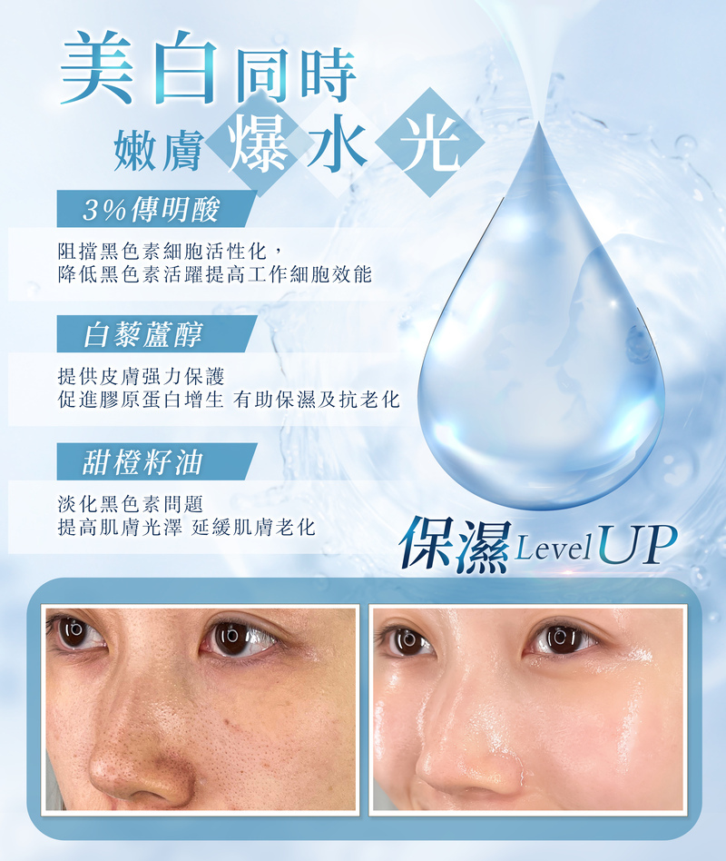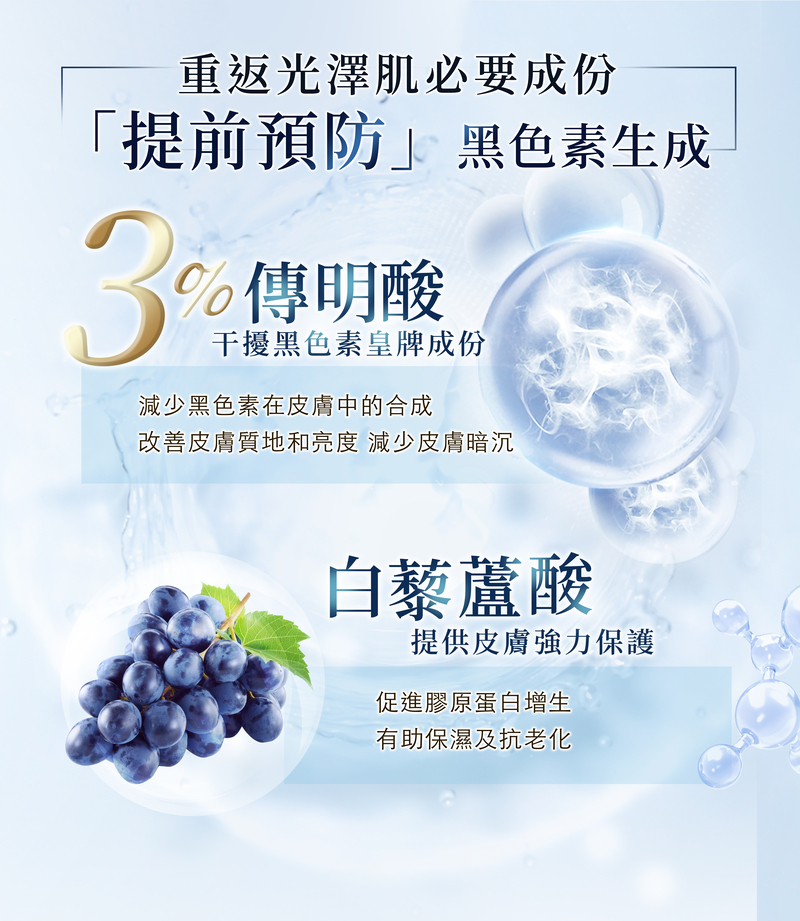 2. **核心成分升級**:融合白藜蘆醇與傳明酸,快速吸收,打造均勻透亮膚色。